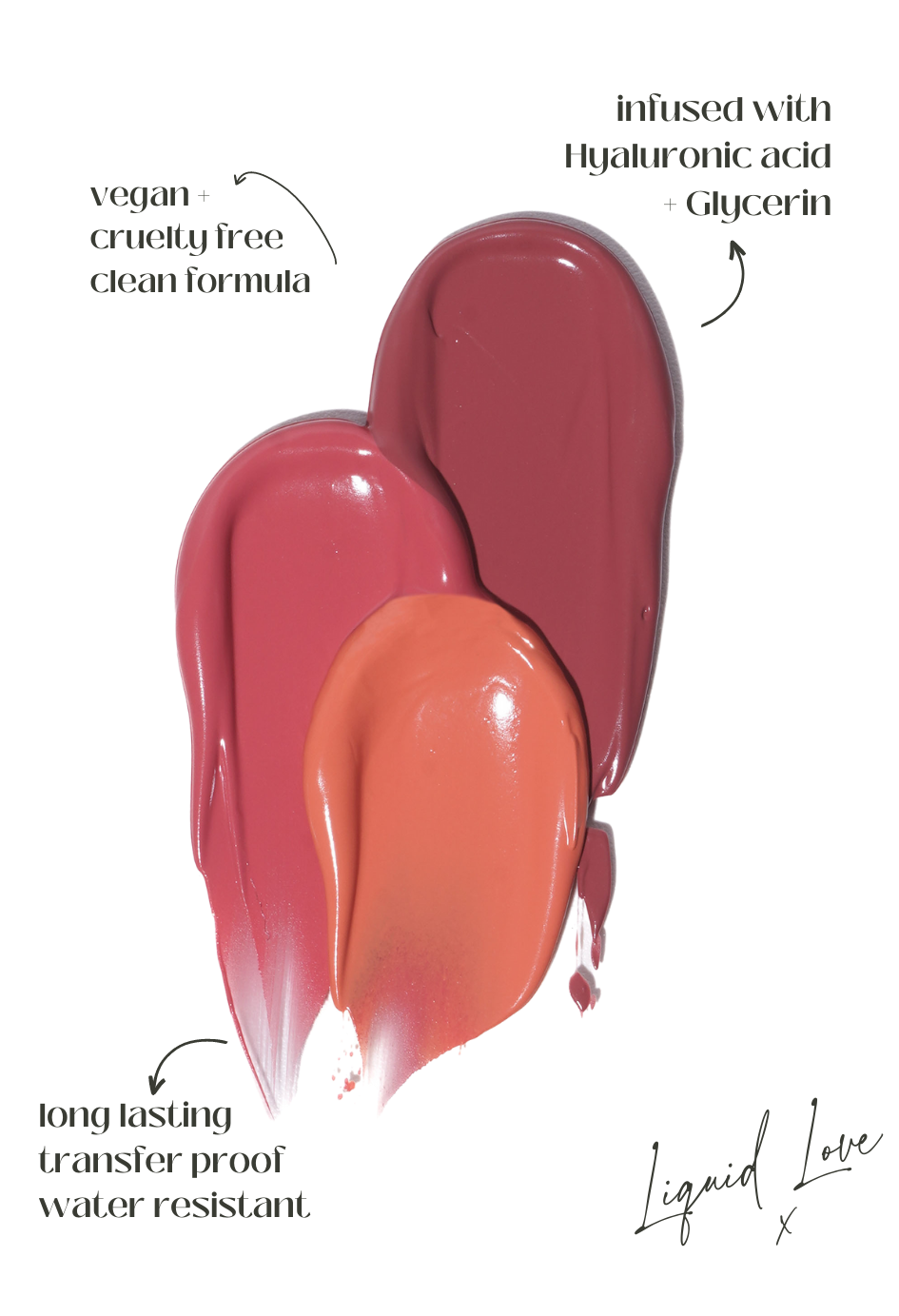 Liquid Love is formulated with the cleanest ingredients. Vegan and cruelty-free goodness wrapped inside sustainable packaging to benefit both you and the earth! We designed this product to suit every skin tone and type under the sun. Whether you're dry, oily, or anything in between, Liquid Love gives you long-lasting, pigmented, and transfer-proof magic without needing to be set!